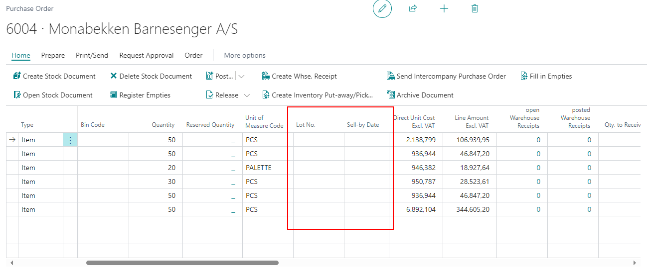 You can now enter a lot no. and a sell-by date directly in the lines of the purchase order as long as it's open. When a purchase order becomes a warehouse receipt, these fields are also automatically adopted. The prerequisite for this is that there is only one item tracking line per order line.