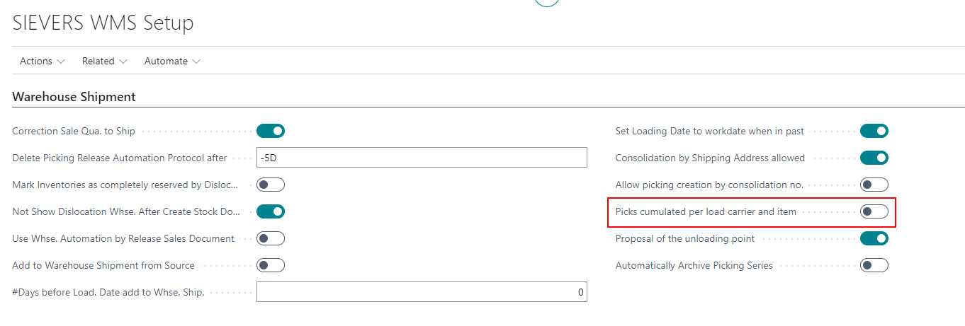 We have added the option Picks cumulated per load carrier and item to the Warehouse Shipment section of the SIEVERS WMS Setup. If this setup is activated, the quantities of the picking items in A4.2 are shown summarized by load carrier and item. If the setup is not active, they are shown by inventory number.