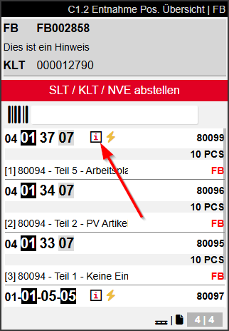 An info symbol is now displayed in the positions of C1.2 Take Out Pos. Overview, C1.3 Take Out Pos. Processing and C2.2 Supply Processing Production when comment text is present.