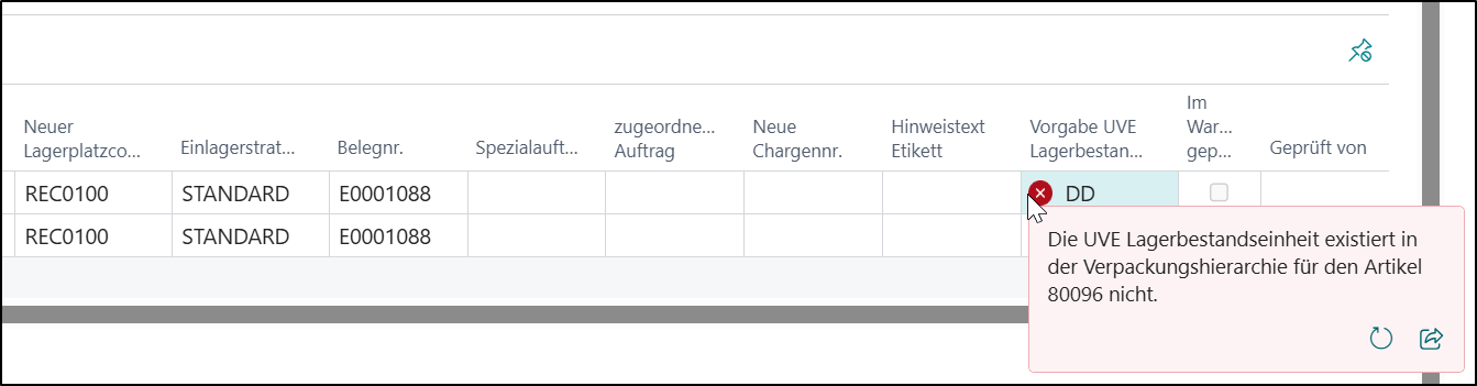 In the field Default SPU Inventory Unit in the document and carrier lines of the warehouse receipt, only values can now be entered that are declared as type Sub-packaging unit in the item's packaging hierarchy. The field is therefore no longer a free text field.