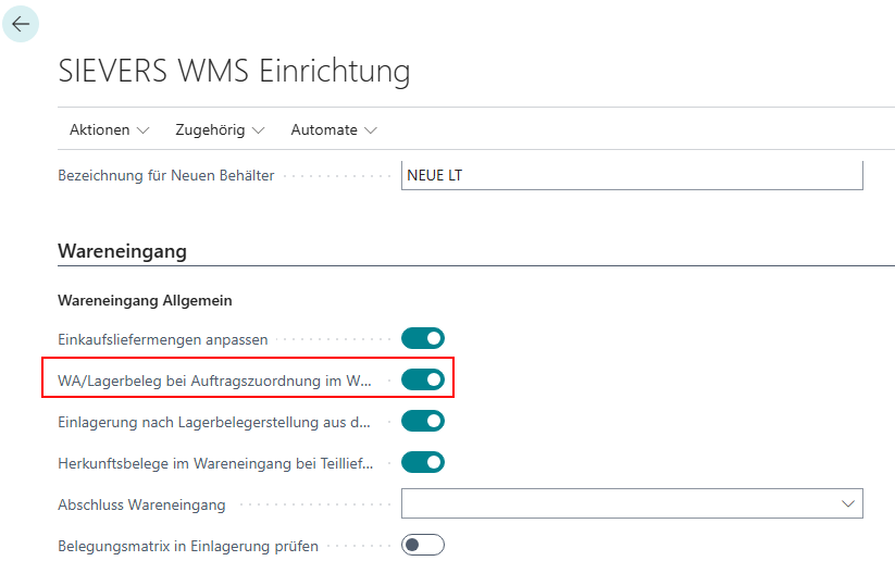 We have inserted a new setup in the Warehouse Receipt area of the SIEVERS WMS Setup: